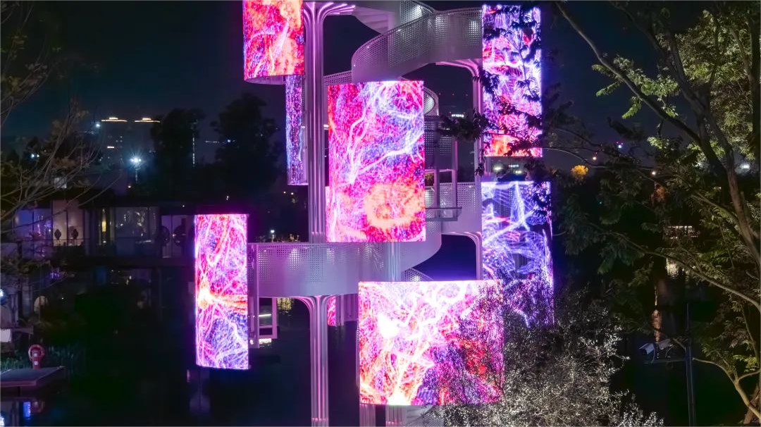 利亞德LED異形顯示屏的應用,助力打破傳統美術館單一功能與形態。利亞德LED異形顯示屏不僅實現了與生命塔建筑外觀的無縫融合,還通過顯示屏的動態旋轉功能,增強了展示的互動性和動態美,讓建筑外觀得以自我更新和擴張,實現靈活和自由的空間布局,成為具有生命力的載體;